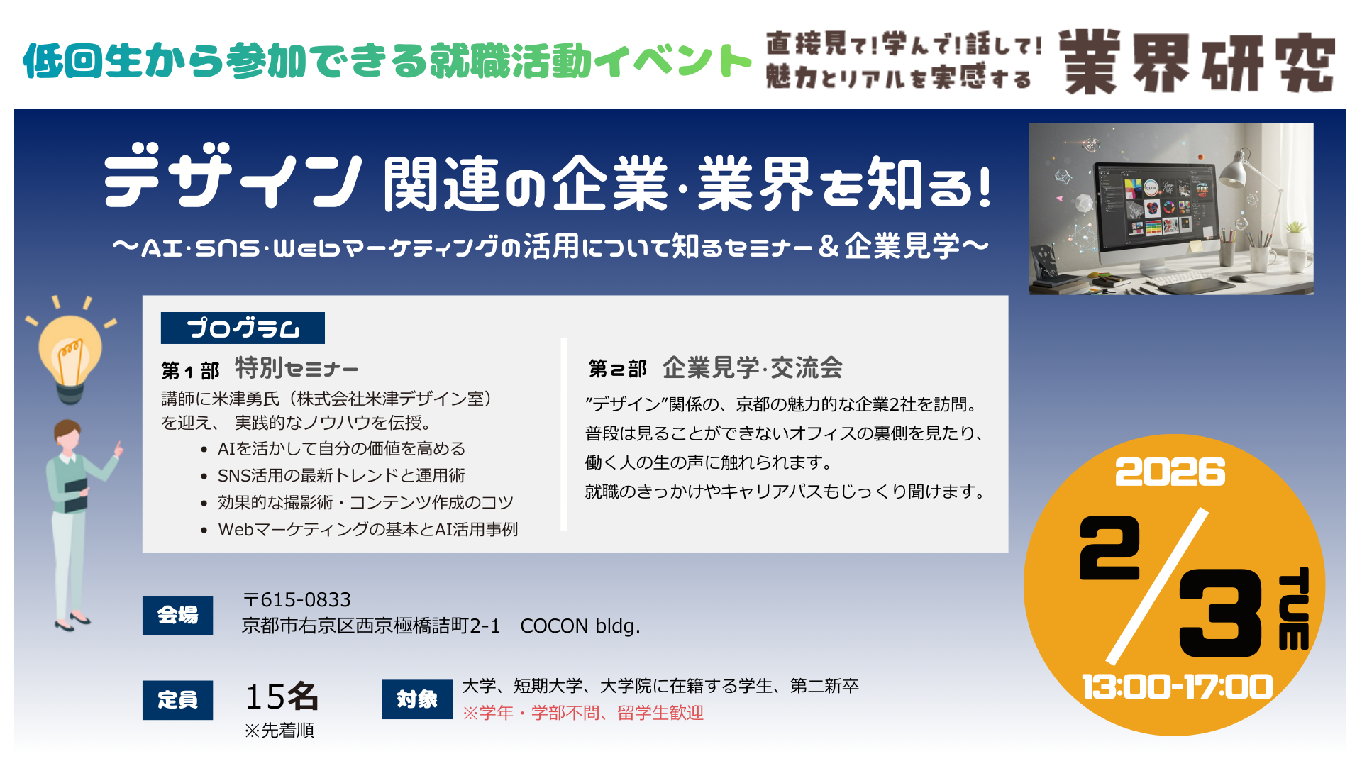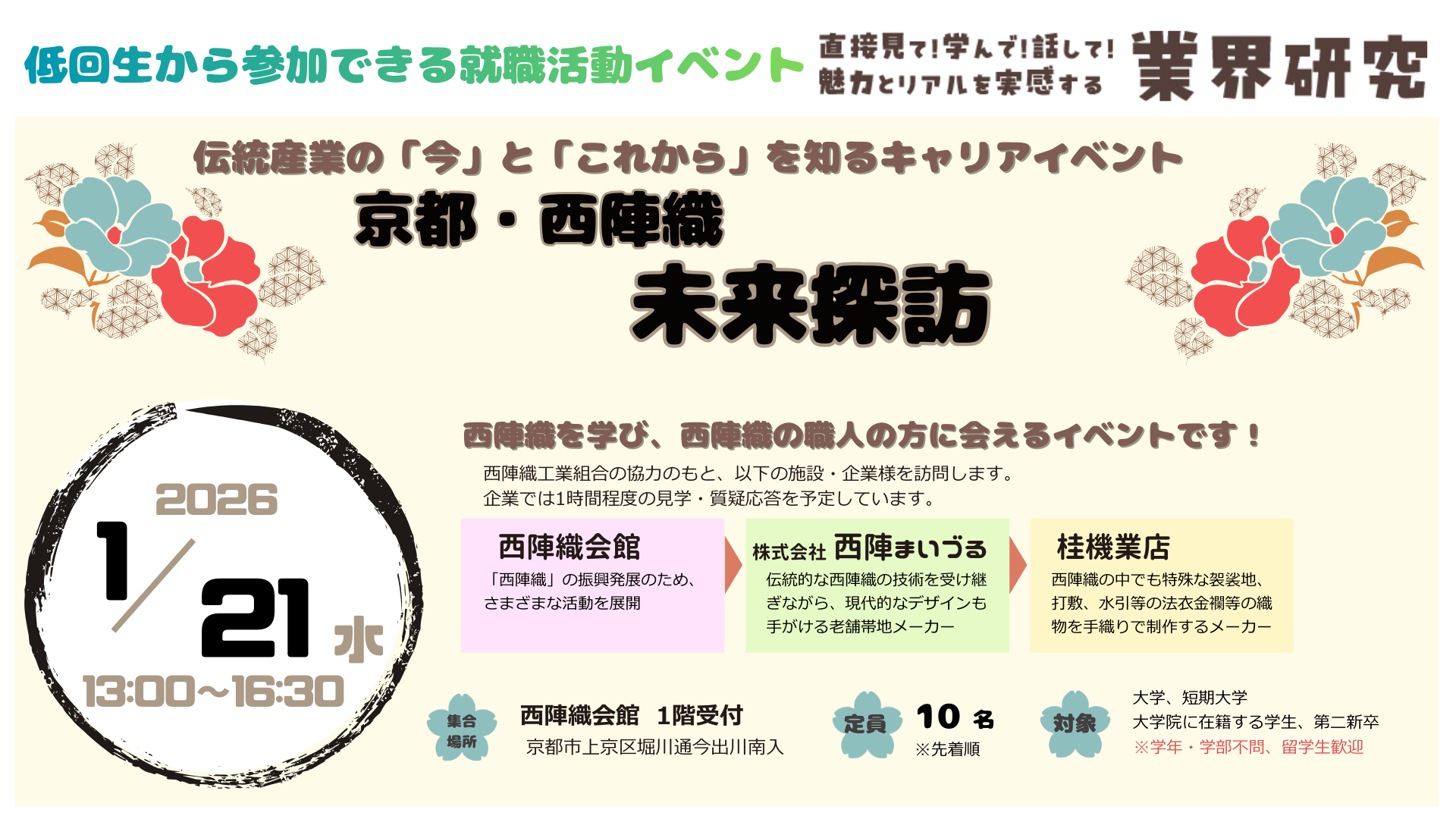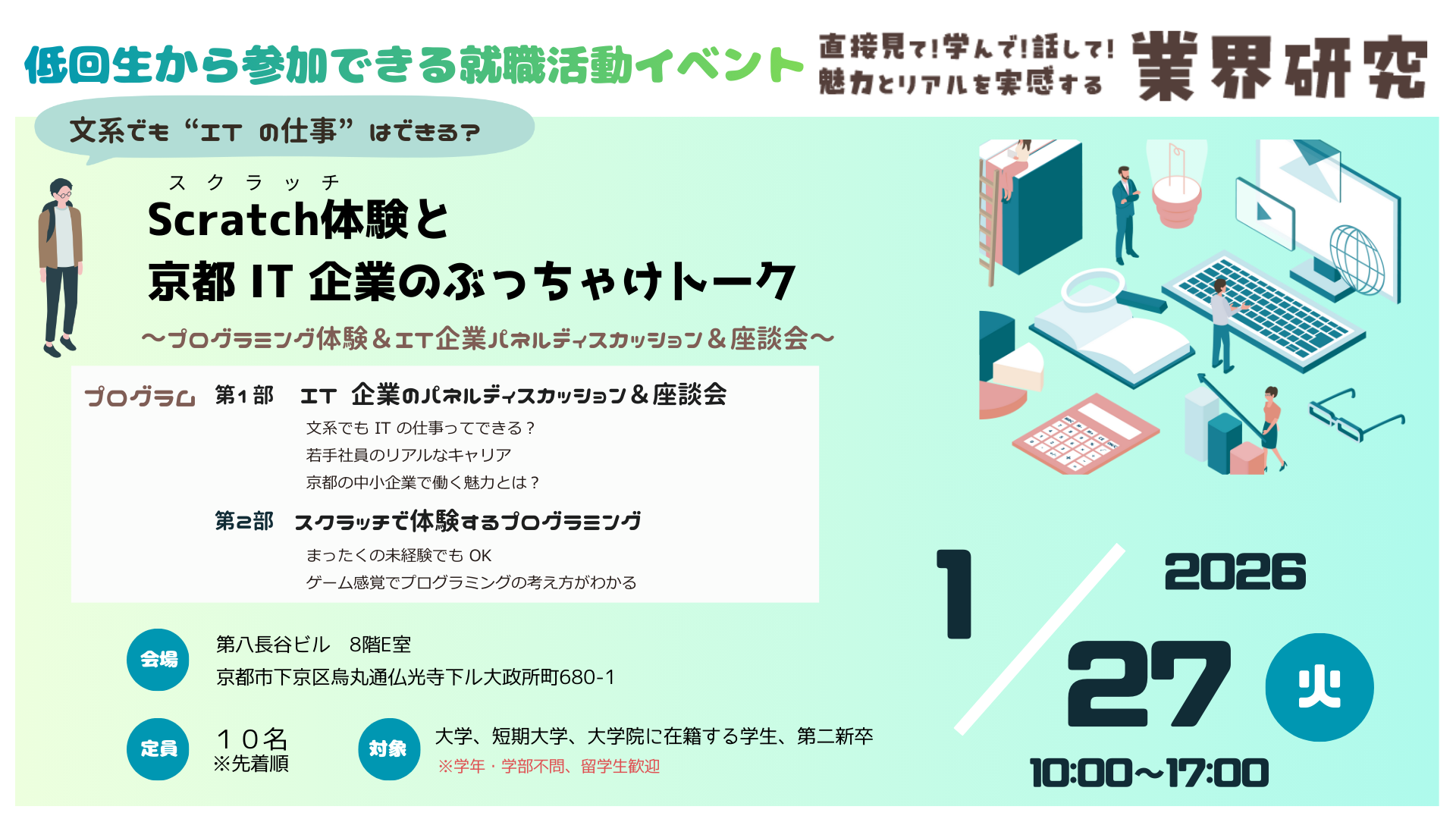 平素より京都市わかもの就職支援センターをご利用いただき誠にありがとうございます。 当センターでは年末年始の休業期間を下記のとおりとさせていただきます。 2025年12月28日(日)~2026年1月5日(月) 1月6日(火)より通常どおりご利用いただけます。 カウンセリング等のご相談は、事前にご予約ください。 申し込みはこちら▼ https://kyoto-wakamono.org/contact/ なお、休業期間中にいただきましたお問い合わせにつきましては、1月6日(火)以降に順次、返信いたします。 何卒ご了承ください。 お問合せ...