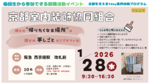 〈終了しました〉京都を支える1day業界体験プログラム「誰かの“帰りたくなる場所”は誰かの手しごとからできている(京都室内装飾協同組合)」参加者募集のお知らせ終了しました〈終了しました〉京都を支える1day業界体験プログラム「誰かの“帰りたくなる場所”は誰かの手しごとからできている(京都室内装飾協同組合)」参加者募集のお知らせ 2026/1/9
