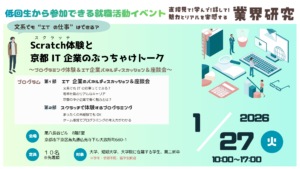 〈終了しました〉「スクラッチ体験と京都 IT 企業のぶっちゃけトーク~プログラミング体験&IT企業パネルディスカッション&座談会~」参加者募集のお知らせ終了しました〈終了しました〉「スクラッチ体験と京都 IT 企業のぶっちゃけトーク~プログラミング体験&IT企業パネルディスカッション&座談会~」参加者募集のお知らせ 2026/1/9